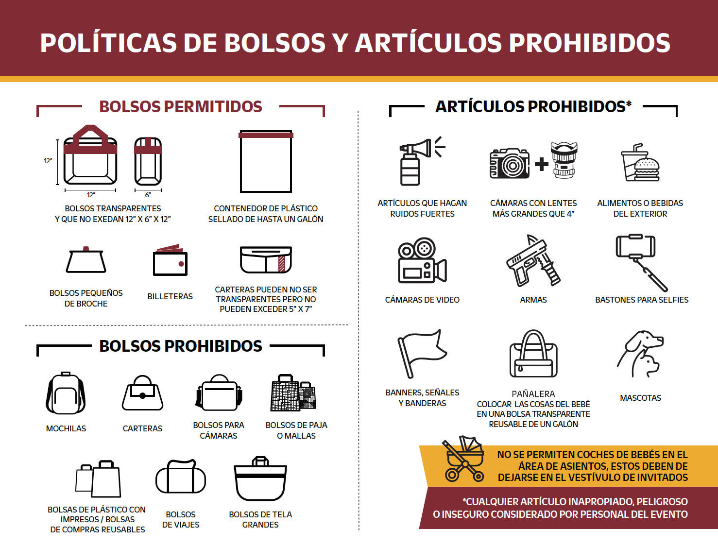 Caesars Superdome ha instituido una póliza de bolso transparente. Haga clic aquí para ver un gráfico de bolsos permitidos y artículos prohibidos.